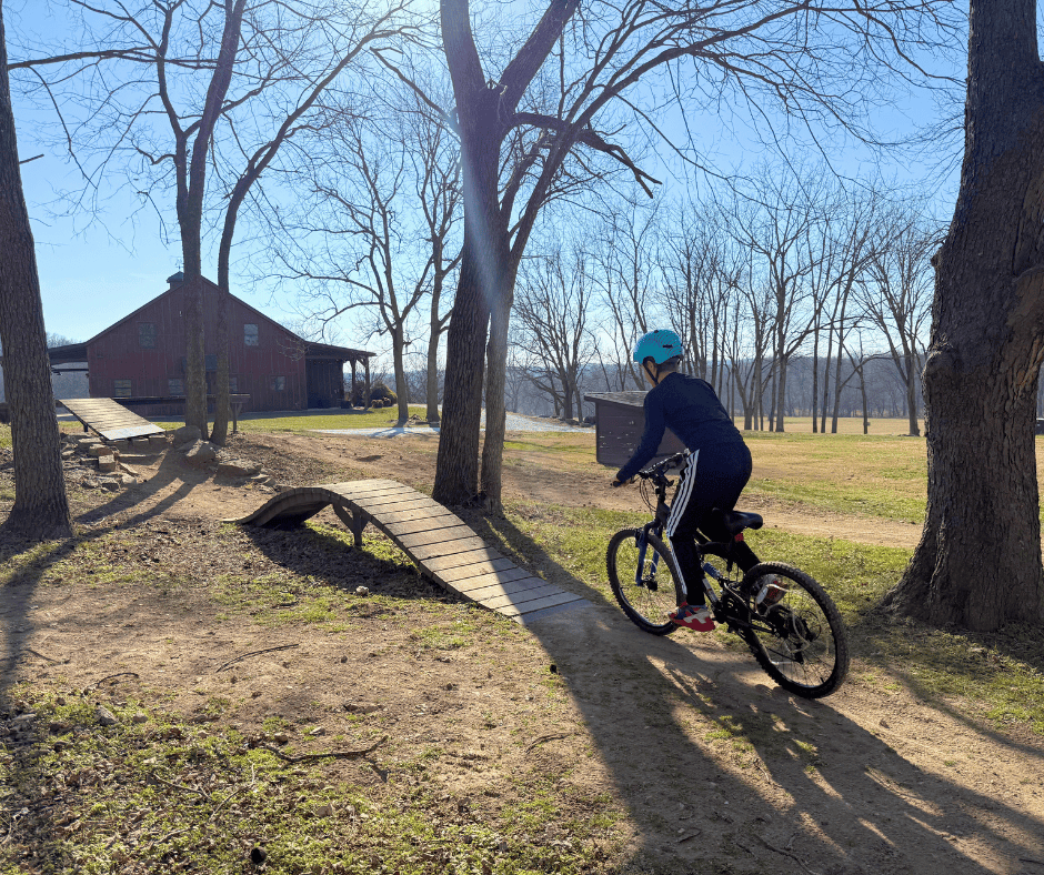 My son enjoyed walking up and down the wooden ramps in the practice area adjacent to the parking lot. Nextdoor, there’s a covered pavilion with picnic tables, as well as Adirondack chairs and firepits in the lawn. Just beyond the firepits is an epic hill for rolling down, or resting to ponder the sky.